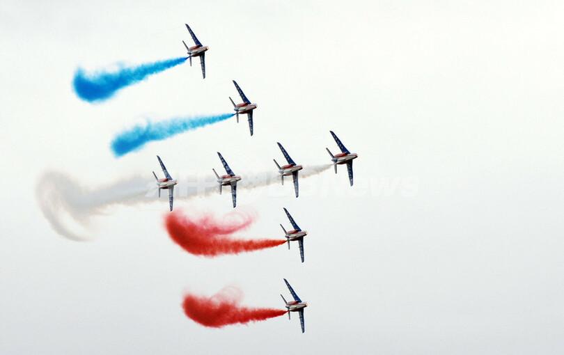 仏パリ(Paris)郊外のルブルジェ(Le Bourget)で開催中の第48回パリ国際航空ショー(Paris International Air Show)は6日目の20日、フランス空軍のアクロバットチーム、パトルイユ・ド・フランス(Patrouille de France)の展示飛行などが行われた。ニコラ・サルコジ(Nicolas Sarkozy)大統領も会場を訪れた。写真は、アクロバット飛行を披露するパトルイユ・ド・フランス(2009年6月20日撮影)。(c)AFP/PIERRE VERDY