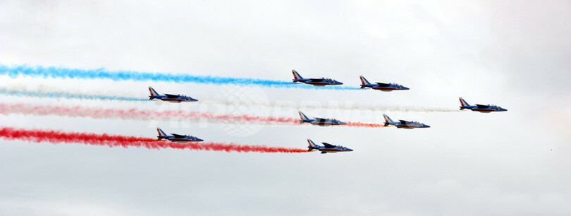 仏パリ(Paris)郊外のルブルジェ(Le Bourget)で開催中の第48回パリ国際航空ショー(Paris International Air Show)は6日目の20日、フランス空軍のアクロバットチーム、パトルイユ・ド・フランス(Patrouille de France)の展示飛行などが行われた。ニコラ・サルコジ(Nicolas Sarkozy)大統領も会場を訪れた。写真は、アクロバット飛行を披露するパトルイユ・ド・フランス(2009年6月20日撮影)。(c)AFP/PIERRE VERDY