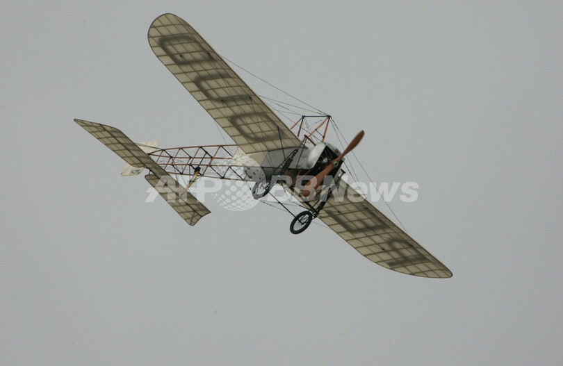 仏パリ(Paris)郊外のルブルジェ(Le Bourget)で開催中の第48回パリ国際航空ショー(Paris International Air Show)は6日目の20日、フランス空軍のアクロバットチーム、パトルイユ・ド・フランス(Patrouille de France)の展示飛行などが行われた。ニコラ・サルコジ(Nicolas Sarkozy)大統領も会場を訪れた。写真は、デモ飛行するブレリオ(Bleriot)のビンテージ機(2009年6月20日撮影)。(c)AFP/PIERRE VERDY