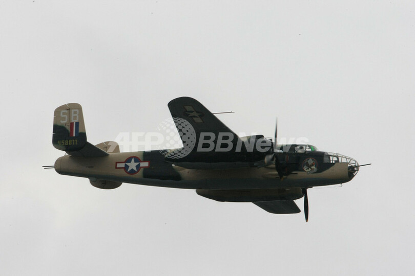 仏パリ(Paris)郊外のルブルジェ(Le Bourget)で開催中の第48回パリ国際航空ショー(Paris International Air Show)は6日目の20日、フランス空軍のアクロバットチーム、パトルイユ・ド・フランス(Patrouille de France)の展示飛行などが行われた。ニコラ・サルコジ(Nicolas Sarkozy)大統領も会場を訪れた。写真は、デモ飛行するノースアメリカン(North American)製B-25ミッチェル(Mitchell 、2009年6月20日撮影)。(c)AFP/PIERRE VERDY