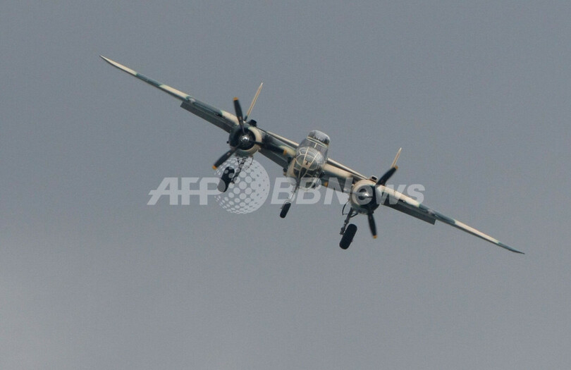 仏パリ(Paris)郊外のルブルジェ(Le Bourget)で開催中の第48回パリ国際航空ショー(Paris International Air Show)は6日目の20日、フランス空軍のアクロバットチーム、パトルイユ・ド・フランス(Patrouille de France)の展示飛行などが行われた。ニコラ・サルコジ(Nicolas Sarkozy)大統領も会場を訪れた。写真は、デモ飛行するノースアメリカン(North American)製B-25ミッチェル(Mitchell 、2009年6月20日撮影)。(c)AFP/PIERRE VERDY
