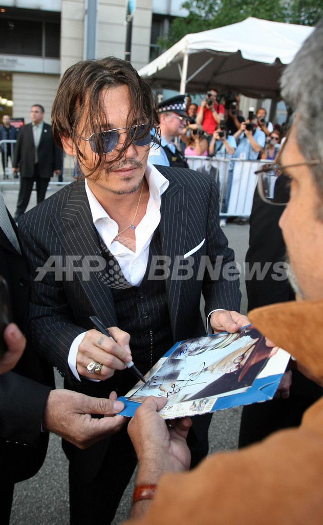 米俳優ジョニー・デップ(Johnny Deep)主演最新作『Public Enemies』のプレミア上映会が18日、米イリノイ(Illinois)州シカゴ(Chicago)で開催された。写真は、会場に到着しファンにサインをするデップ(2009年6月18日撮影)。(c)AFP/Getty Images/Tasos Katopodis