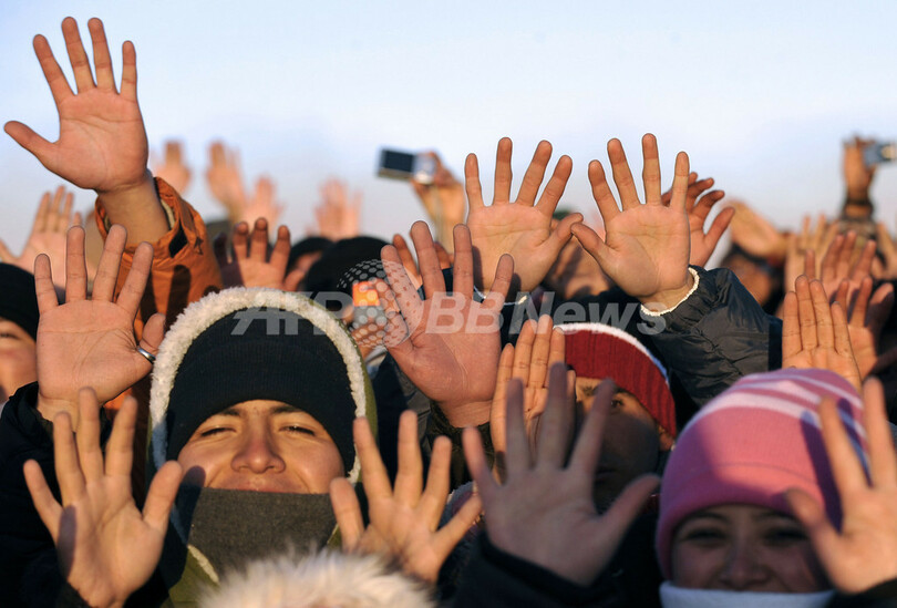 ボリビア・ラパス(La Paz)の東71キロにあるティワナク(Tiwanaku、Tiahuanaco)遺跡で21日、アイマラ(Aymara)系先住民の正月にあたる冬至祭が行われた。この祭りには約3万人が参加し、アイマラの暦で5517年の幕開けを祝うという。写真は、暦として使われていたとされる石門「太陽の門(Gateway of the Sun)」から差し込む初日の出「Tata Inti(「神の太陽」)」を受けるために手をかざす人びと(2009年6月21日撮影)。(c)AFP/Aizar Raldes