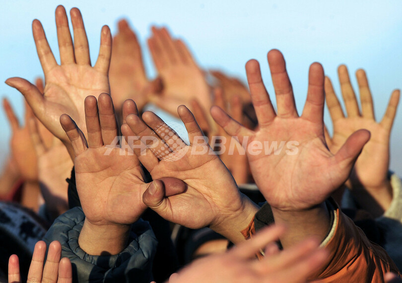 ボリビア・ラパス(La Paz)の東71キロにあるティワナク(Tiwanaku、Tiahuanaco)遺跡で21日、アイマラ(Aymara)系先住民の正月にあたる冬至祭が行われた。この祭りには約3万人が参加し、アイマラの暦で5517年の幕開けを祝うという。写真は、暦として使われていたとされる石門「太陽の門(Gateway of the Sun)」から差し込む初日の出「Tata Inti(「神の太陽」)」を受けるために手をかざす人びと(2009年6月21日撮影)。(c)AFP/Aizar Raldes