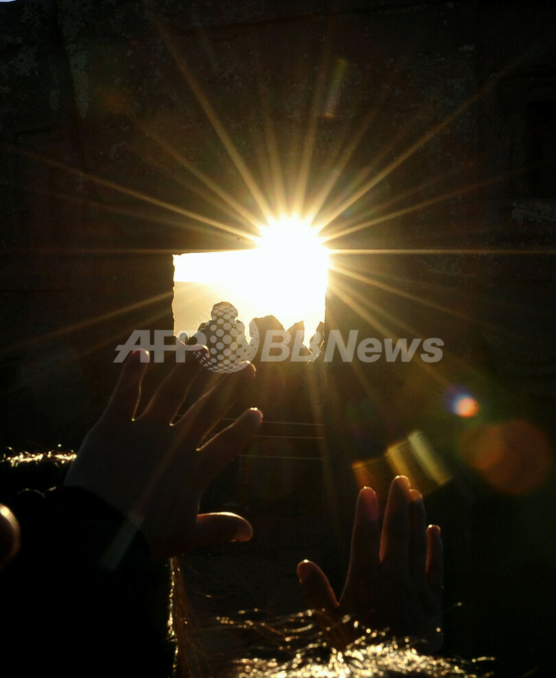 ボリビア・ラパス(La Paz)の東71キロにあるティワナク(Tiwanaku、Tiahuanaco)遺跡で21日、アイマラ(Aymara)系先住民の正月にあたる冬至祭が行われた。この祭りには約3万人が参加し、アイマラの暦で5517年の幕開けを祝うという。写真は、暦として使われていたとされる石門「太陽の門(Gateway of the Sun)」から差し込む初日の出「Tata Inti(「神の太陽」)」を受けるために手をかざす人びと(2009年6月21日撮影)。(c)AFP/Aizar Raldes