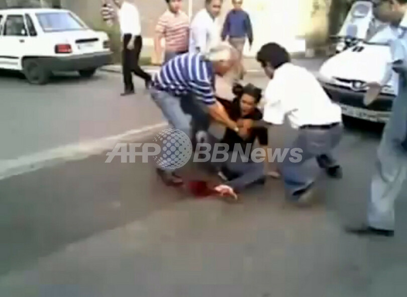 写真は、動画共有サイト・ユーチューブ(YouTube)に21日投稿された、テヘランでの抗議行動の最中に胸を撃たれて負傷した「ネダ(Neda)」という名の16歳の少女を介抱する人々の映像(2009年6月20日撮影、21日提供)。(c)AFP/YouTube