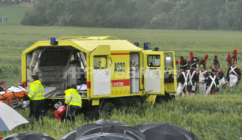 写真は、再現イベントで負傷した参加者を収容する医療関係者(2009年6月21日撮影)。(c)AFP/DOMINIQUE FAGET