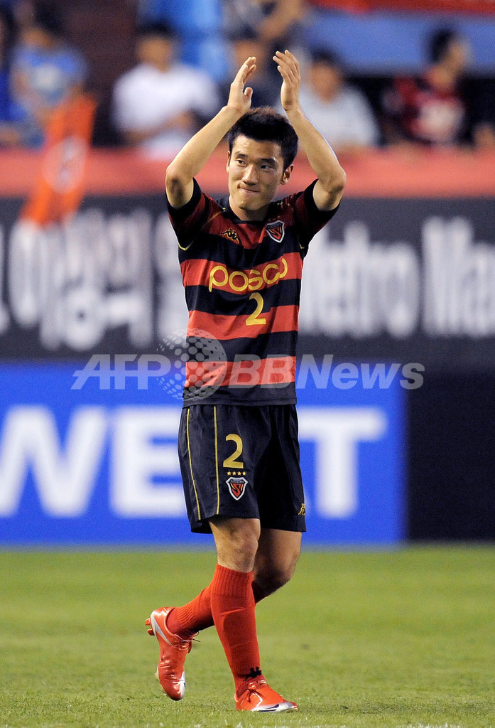 サッカーAFCチャンピオンズリーグ2009(%%AFC Champions League 2009%%)決勝トーナメント1回戦、浦項スティーラース(%%Pohang Steelers%%)対ニューカッスル・ジェッツ(%%Newcastle Jets%%)。試合はスティーラースが6-0で快勝し、準々決勝に進出した。写真は後半26分にハットトリックを達成し、声援に応える浦項スティーラースの崔孝鎭(%%Choi Hyo-Jin%%、チェ・ヒョジン)。(2009年6月24日撮影)(c)AFP/JUNG YEON-JE