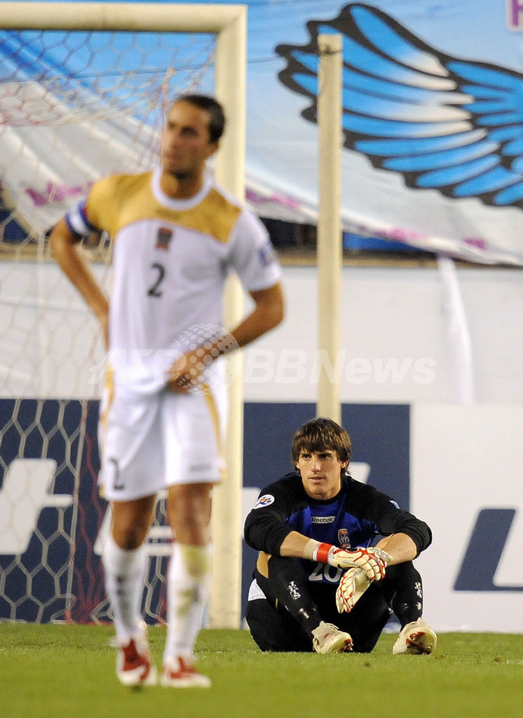 サッカーAFCチャンピオンズリーグ2009(%%AFC Champions League 2009%%)決勝トーナメント1回戦、浦項スティーラース(%%Pohang Steelers%%)対ニューカッスル・ジェッツ(%%Newcastle Jets%%)。試合はスティーラースが6-0で快勝し、準々決勝に進出した。写真は失点を喫して落胆するニューカッスル・ジェッツのベン・ケネディ(%%Ben Kennedy%%、右)とタレク・エルリッヒ(%%Tarek Elrich%%)。(2009年6月24日撮影)(c)AFP/JUNG YEON-JE