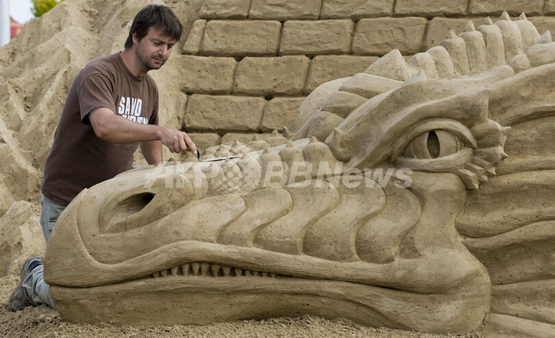 【6月25日 AFP】ドイツ東部の町ギュンタースドルフ(Guenthersdorf)で開かれている砂像の世界大会で、ドラゴンの砂像を作るオランダの芸術家Martin D. Zoeteさん。この大会には、世界から各チームが参加している。(c)AFP