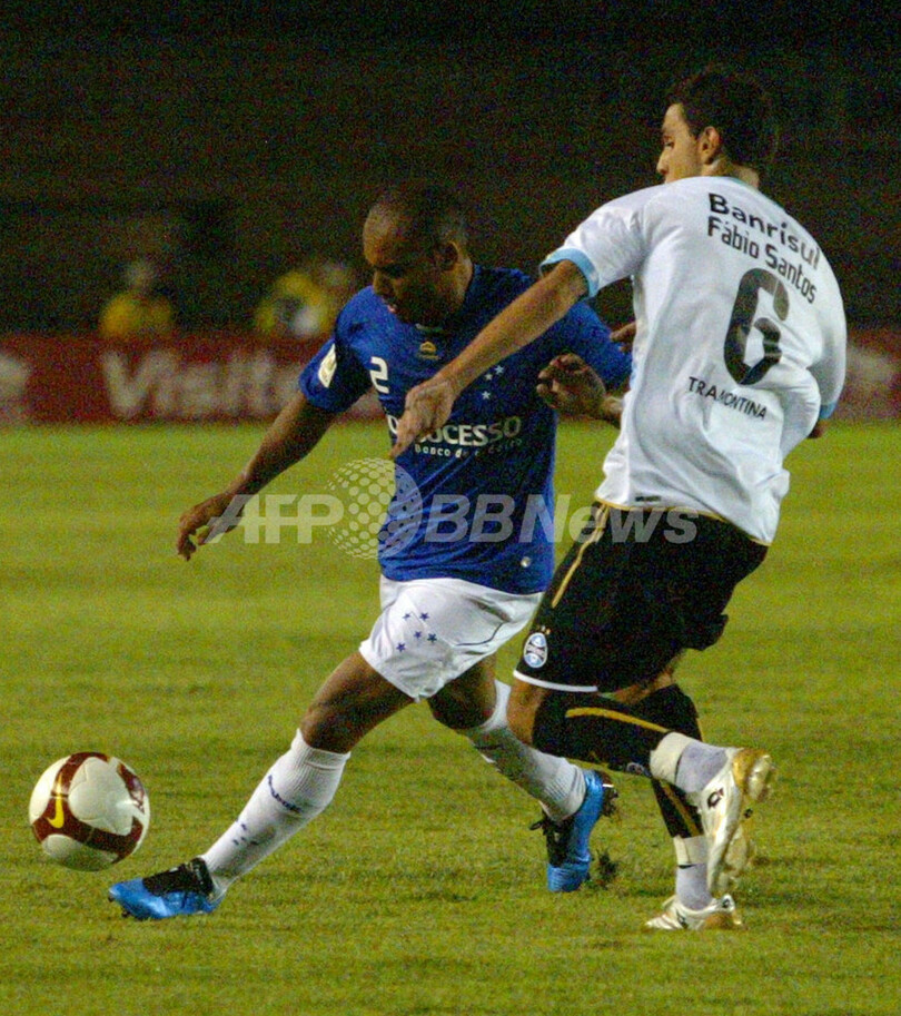 サッカーリベルタドーレス杯2009(%%Copa Libertadores de America 2009%%)準決勝、クルゼイロEC(%%Cruzeiro EC%%、ブラジル)対グレミオ(%%Gremio%%、ブラジル)第1戦。試合はクルゼイロが3-1で勝利し、ホームでの初戦を白星で飾った。写真はグレミオのファビオ・サントス(%%Fabio Santos Romeu%%)と競り合うクルゼイロのホナタン(%%Jonathan Cicero Moreira%%、左)。(2009年6月24日撮影)(c)AFP/MAURICIO DE SOUZA