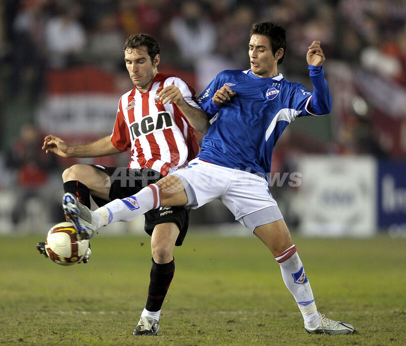 サッカーリベルタドーレス杯2009(%%Copa Libertadores de America 2009%%)準決勝、エストゥディアンテス(%%Estudiantes%%、アルゼンチン)対ナシオナル・モンテビデオ(%%Nacional Montevideo%%、ウルグアイ)第1戦。試合はエストゥディアンテスが1-0で勝利し、初戦を飾った。写真はボールを競り合うエストゥディアンテスのマウロ・ボセッリ(%%Mauro Boselli%%、左)とナシオナル・モンテビデオのマティアス・ロドリゲス(%%Matias Rodriguez%%)。(2009年6月25日撮影)(c)AFP/ALEJANDRO PAGNI