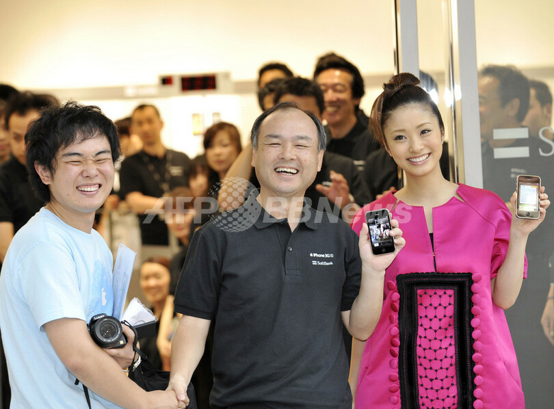 写真は、都内のソフトバンクショップで行われた発売記念イベントに登場した孫正義(Masayoshi Son)社長(中央)とタレントの上戸彩(Aya Ueto、右)と並ぶ最初に「iPhone 3GS」を購入した男性(2009年6月26日撮影)。(c)AFP/Yoshikazu TSUNO