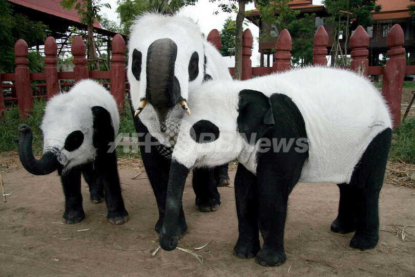【6月26日 AFP】タイの古都アユタヤ(Ayutthaya)郊外にあるゾウの訓練施設「エレファント・キャンプ」でこのほど、白黒のパンダ色に塗られたゾウたちが注目を集めている。これは、チェンマイ(Chiang Mai)の動物園で前月、同国初となるパンダの赤ちゃんが生まれたことを記念したイベントだ。長年におよび人工授精を試みた末のパンダの赤ちゃん誕生に、タイ中が歓びにわいている。(c)AFP