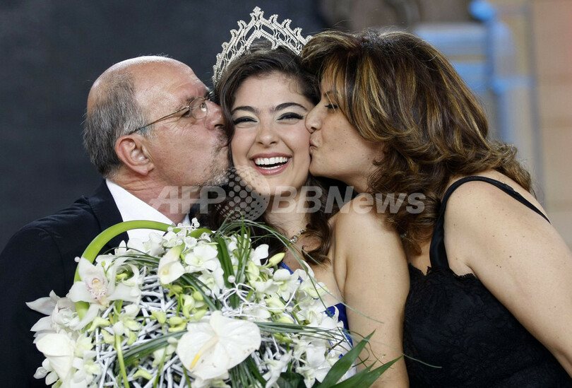 レバノンのアドマ(Adma)で開かれた「ミス・レバノン2009(Miss Lebanon 2009)」の最終選考会で優勝した18歳のMartine Indraousさん(中央)を祝福する両親(2009年6月26日撮影)。(c)AFP/JOSEPH BARRAK