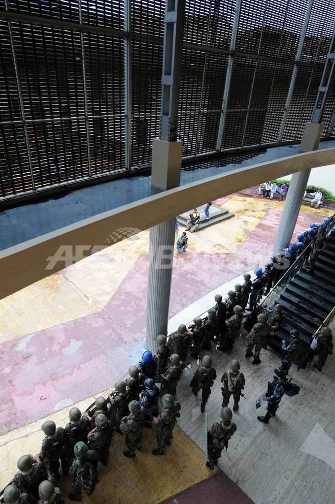 ホンジュラスでは改憲により大統領の再選を可能にして2期目を目指そうとしていたセラヤ前大統領と、改憲に反対する軍および裁判所との間で政治的対立が続いていたが、軍が同日早朝、大統領の身柄を拘束し空路コスタリカのサンホセ(San Jose)に追放した。(c)AFP