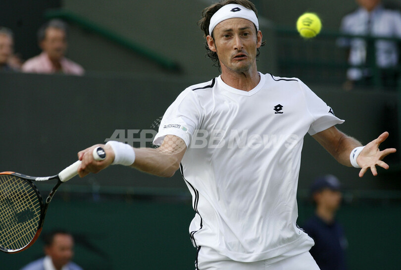 テニス、ウィンブルドン選手権(%%The Championships Wimbledon 2009%%)男子シングルス4回戦。スペインのファン・カルロス・フェレーロ(%%Juan Carlos Ferrero%%)は、大会第8シードのジル・シモン(%%Gilles Simon%%、フランス)と対戦。フェレーロは7-6、6-3、6-2でシモンを下し、準々決勝に進出した。写真はリターンショットを放つファン・カルロス・フェレーロ。(2009年6月29日撮影)(c)AFP/GLYN KIRK
