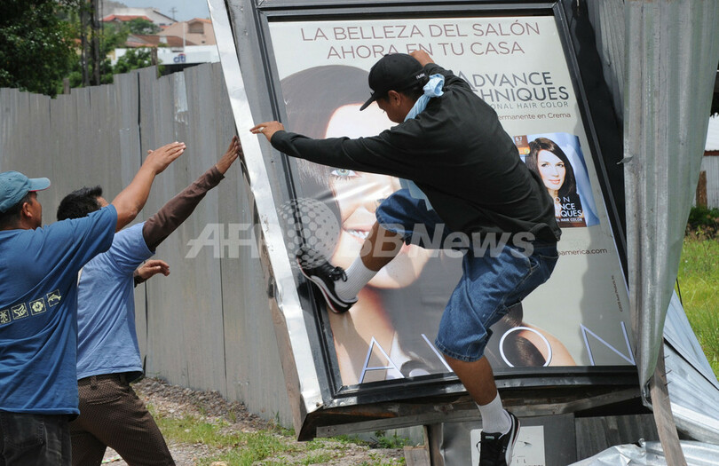 クーデターでホセ・マヌエル・セラヤ(Jose Manuel Zelaya)大統領が国外追放されたホンジュラスでは29日、クーデターに抗議するセラヤ大統領支持派が警官隊や兵士と衝突した。AFPのカメラマンによると、前日に発令された48時間の外出禁止令にもかかわらず、セラヤ氏支持者ら数百人が首都テグシガルパ(Tegucigalpa)の大統領官邸付近にバリケードを築き、投石や棒などを使い警官隊と衝突した。この事態に、治安部隊が出動して催涙ガスや銃の発砲などで鎮圧にあたっている。大統領支持者と治安部隊の双方に負傷者が出ているという。写真は、大統領官邸付近でバリケードを築くために看板を壊す抗議行動参加者(2009年6月29日撮影)。(c)AFP/ORLANDO SIERRA