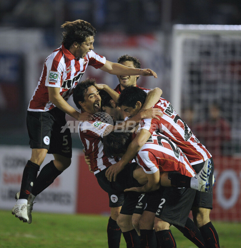 サッカーリベルタドーレス杯2009(%%Copa Libertadores de America 2009%%)準決勝、ナシオナル・モンテビデオ(%%Nacional Montevideo%%、ウルグアイ)対エストゥディアンテス(%%Estudiante%%s、アルゼンチン)第2戦。試合は第1戦を勝利しているエストゥディアンテスが2-1でナシオナルに連勝し、2試合合計スコアを3-1として決勝に進出した。写真はマウロ・ボセッリ(%%Mauro Boselli%%)の挙げた得点に歓喜するエストゥディアンテスの選手たち。(2009年7月1日撮影)(c)AFP/MIGUEL ROJO