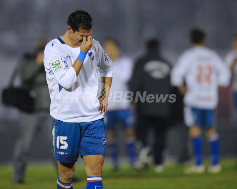 サッカーリベルタドーレス杯2009(%%Copa Libertadores de America 2009%%)準決勝、ナシオナル・モンテビデオ(%%Nacional Montevideo%%、ウルグアイ)対エストゥディアンテス(%%Estudiante%%s、アルゼンチン)第2戦。試合は第1戦を勝利しているエストゥディアンテスが2-1でナシオナルに連勝し、2試合合計スコアを3-1として決勝に進出した。写真は落胆した様子を見せるナシオナル・モンテビデオのアドリアン・ロメロ(%%Adrian Romero%%)。(2009年7月1日撮影)(c)AFP/MIGUEL ROJO