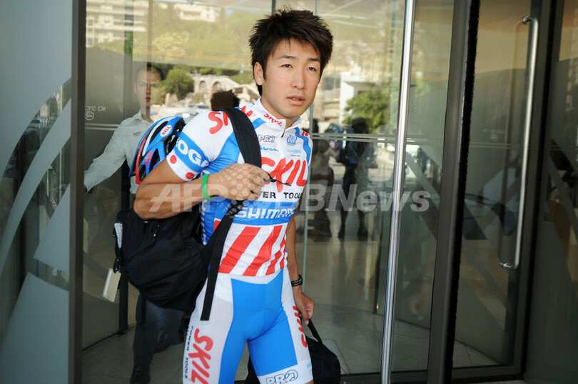 開幕を4日に控える2009ツール・ド・フランス(%%2009 Tour de France%%)の出場チームが2日、スタート地のモナコ(Monaco)で開催された公式プレゼンテーションに参加し、スキル・シマノ(%%Skil-Shimano%%)の別府史之(%%Fumiyuki Beppu%%、日本)やBBOXブイグ・テレコム(%%BBOX Bouygues Telecom%%)の新城幸也(%%Yukiya Arashiro%%、日本)らが登場した。写真は練習へ向かうためホテルを出る別府史之。(2009年7月2日撮影)(c)AFP/PATRICK HERTZOG