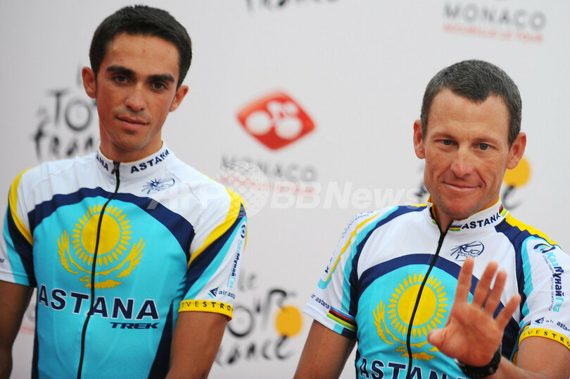 開幕を4日に控える2009ツール・ド・フランス(%%2009 Tour de France%%)の出場チームが2日、スタート地のモナコ(Monaco)で開催された公式プレゼンテーションに参加し、スキル・シマノ(%%Skil-Shimano%%)の別府史之(%%Fumiyuki Beppu%%、日本)やBBOXブイグ・テレコム(%%BBOX Bouygues Telecom%%)の新城幸也(%%Yukiya Arashiro%%、日本)らが登場した。写真は公式プレゼンテーションに出席するアスタナ(%%Astana%%)のアルベルト・コンタドール(%%Alberto Contador%%、左)とランス・アームストロング(%%Lance Armstrong%%)。(2009年7月2日撮影)(c)AFP/LIONEL BONAVENTURE