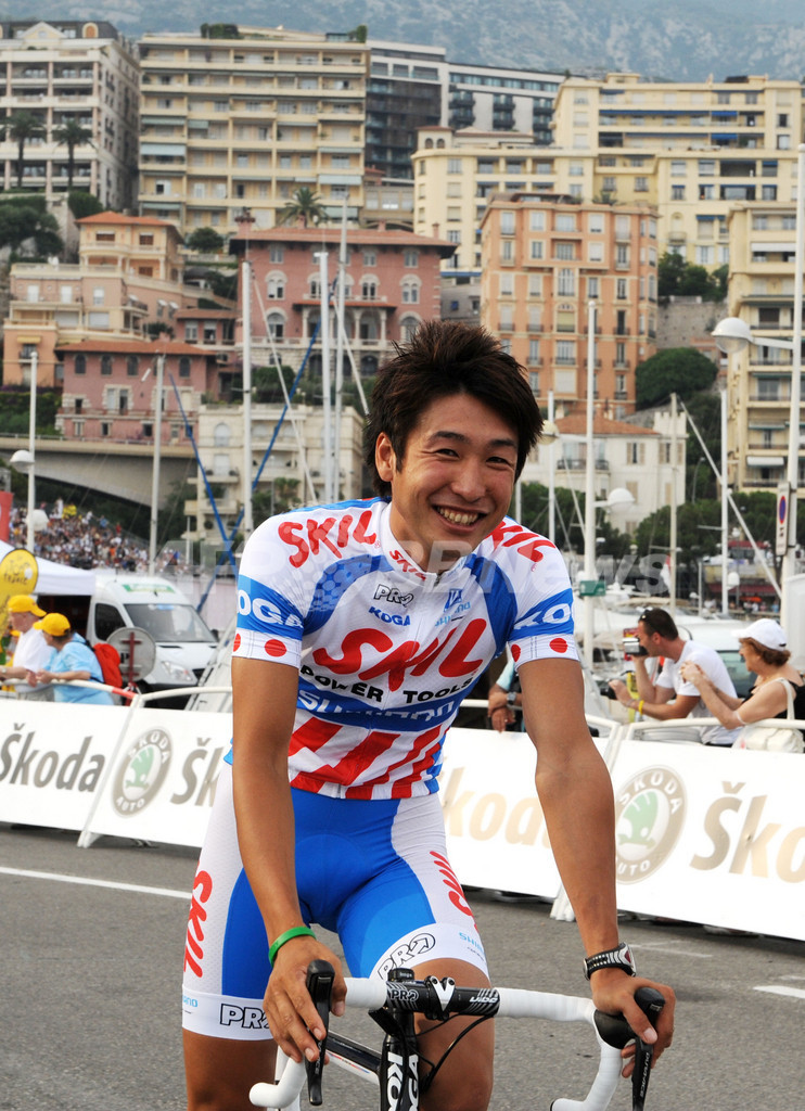 開幕を4日に控える2009ツール・ド・フランス(%%2009 Tour de France%%)の出場チームが2日、スタート地のモナコ(Monaco)で開催された公式プレゼンテーションに参加し、スキル・シマノ(%%Skil-Shimano%%)の別府史之(%%Fumiyuki Beppu%%、日本)やBBOXブイグ・テレコム(%%BBOX Bouygues Telecom%%)の新城幸也(%%Yukiya Arashiro%%、日本)らが登場した。写真は公式プレゼンテーション会場を去る別府史之。(2009年7月2日撮影)(c)AFP/PATRICK HERTZOG
