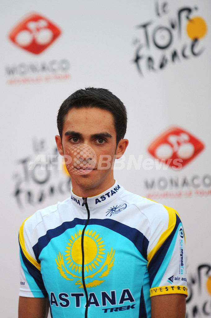 開幕を4日に控える2009ツール・ド・フランス(%%2009 Tour de France%%)の出場チームが2日、スタート地のモナコ(Monaco)で開催された公式プレゼンテーションに参加し、スキル・シマノ(%%Skil-Shimano%%)の別府史之(%%Fumiyuki Beppu%%、日本)やBBOXブイグ・テレコム(%%BBOX Bouygues Telecom%%)の新城幸也(%%Yukiya Arashiro%%、日本)らが登場した。写真は公式プレゼンテーションに出席するアスタナ(%%Astana%%)のアルベルト・コンタドール(%%Alberto Contador%%、スペイン)。(2009年7月2日撮影)(c)AFP/LIONEL BONAVENTURE