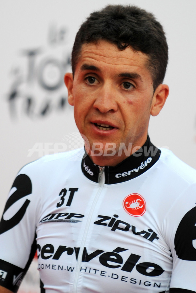 開幕を4日に控える2009ツール・ド・フランス(%%2009 Tour de France%%)の出場チームが2日、スタート地のモナコ(Monaco)で開催された公式プレゼンテーションに参加し、スキル・シマノ(%%Skil-Shimano%%)の別府史之(%%Fumiyuki Beppu%%、日本)やBBOXブイグ・テレコム(%%BBOX Bouygues Telecom%%)の新城幸也(%%Yukiya Arashiro%%、日本)らが登場した。写真は公式プレゼンテーションに出席するサーベロ・テストチーム(%%Cervelo Test Team%%)のカルロス・サストレ(%%Carlos Sastre%%、スペイン)。(2009年7月2日撮影)(c)AFP/LIONEL BONAVENTURE