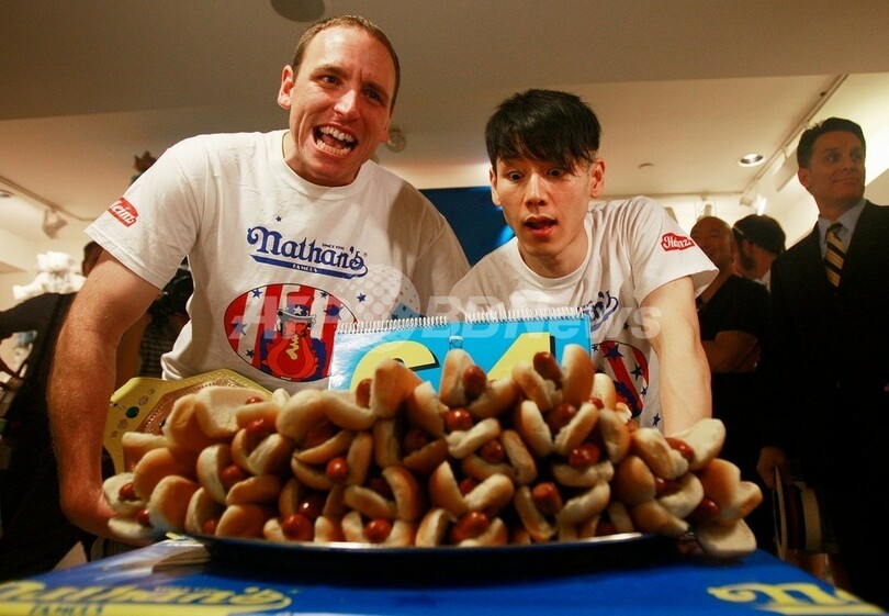 【7月3日 AFP】毎年米国の独立記念日に開かれているホットドック早食い大会「Nathan’s Famous Hot Dog Eating Contest」に先立ち行われる計量セレモニーが2日、ニューヨーク(New York)で行われた。前年大会では、カリフォルニア(Californian)州のジョーイ・チェスナット(Joey Chestnut)さんが、優勝決定戦で日本の小林尊(Takeru Kobayashi)さんを下している。(c)AFP
