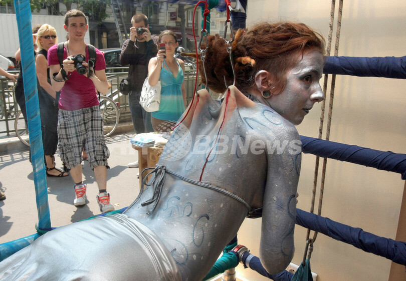 【7月3日 AFP】フランス・パリ(Paris)で2日、環境活動家でアーティストの女性が、絶滅の恐れがあるサメの保護を訴えようと、体にサメ用の「釣り針」を突き刺し、店のショーウィンドーで天井からつり下げられるパフォーマンスを行った。