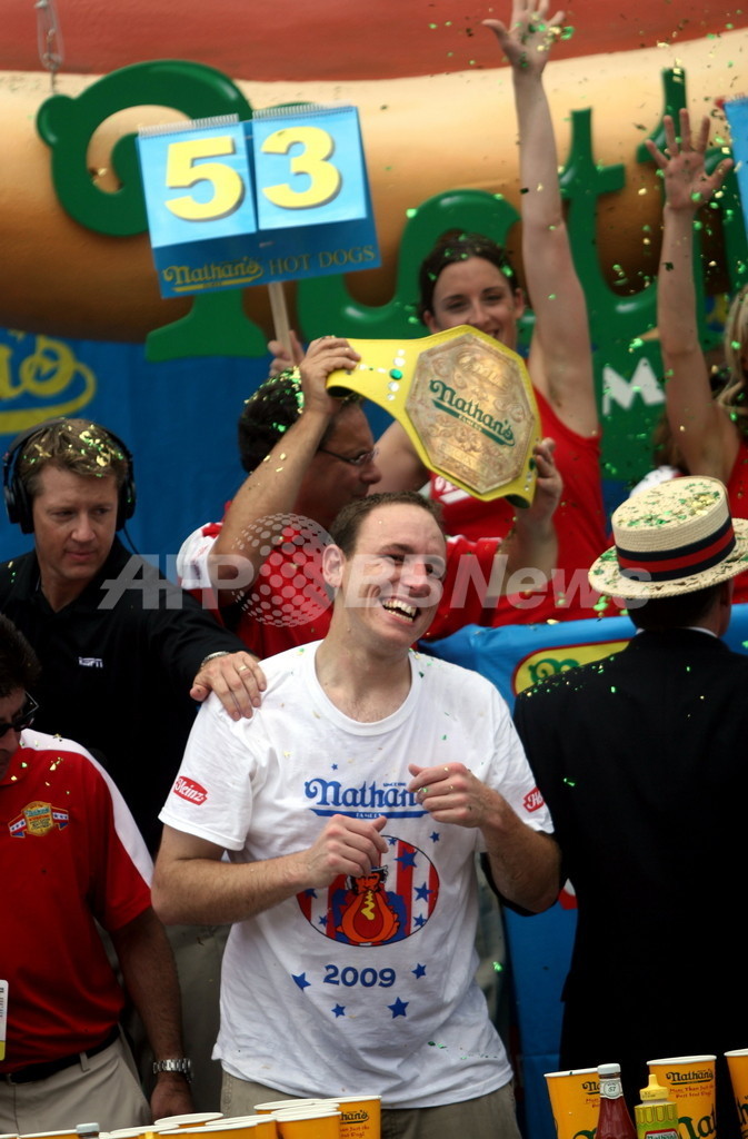 写真は、優勝したジョーイ・チェスナット(Joey Chestnut)さん(中央、2009年7月4日撮影)。(c)AFP/Getty Images/Yana Paskova