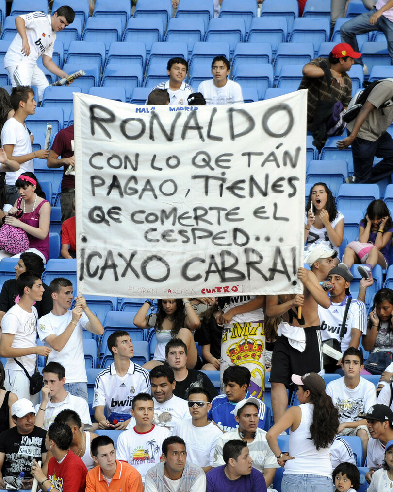 イングランド・プレミアリーグのマンチェスター・ユナイテッド(%%Manchester United%%)から念願の移籍がかなったクリスティアーノ・ロナウドは、ファンの前で「ここにいることに大きな幸せを感じている。レアル・マドリードでプレーするという小さい頃からの夢がかなった。ただ僕を見るためだけに、スタジアムが満員になるとは思ってもいなかった」と語った。写真はクリスティアーノ・ロナウドへのメッセージがつづられたバナーを掲げるファン。(2009年7月6日撮影)(c)AFP/DANI POZO