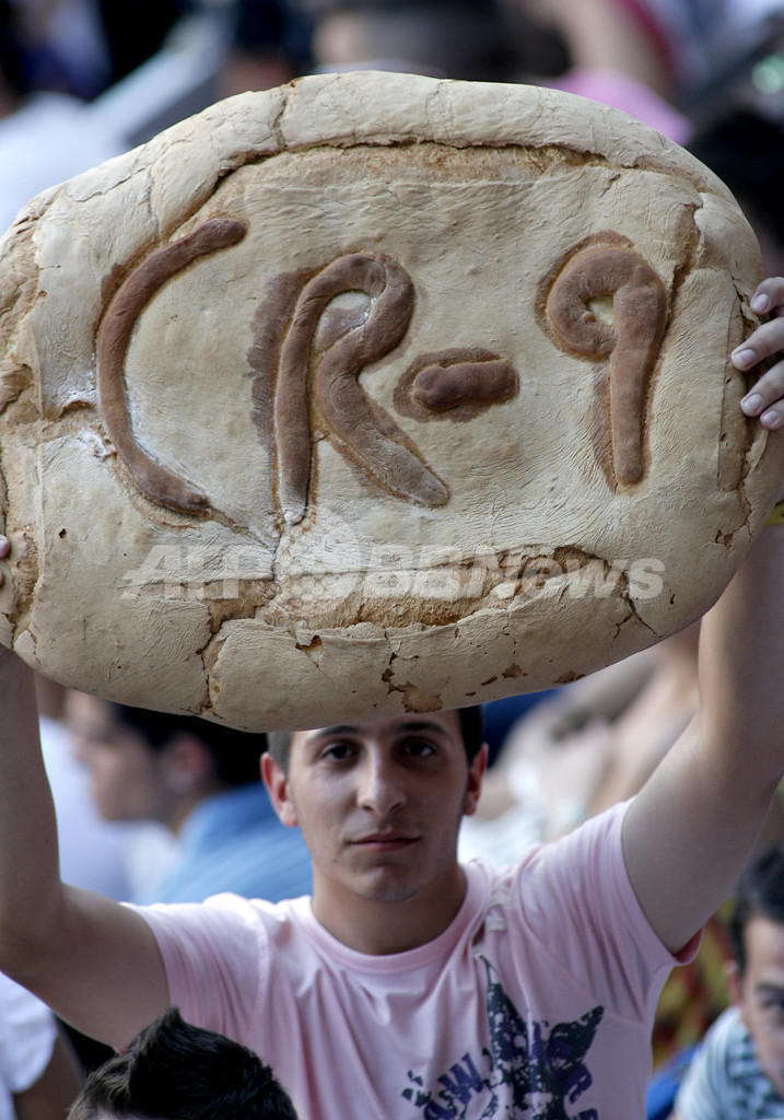 イングランド・プレミアリーグのマンチェスター・ユナイテッド(%%Manchester United%%)から念願の移籍がかなったクリスティアーノ・ロナウドは、ファンの前で「ここにいることに大きな幸せを感じている。レアル・マドリードでプレーするという小さい頃からの夢がかなった。ただ僕を見るためだけに、スタジアムが満員になるとは思ってもいなかった」と語った。写真はクリスティアーノ・ロナウドのイニシャルと背番号が入ったパンを掲げるファン。(2009年7月6日撮影)(c)AFP/SALVADOR RODRIGUEZ