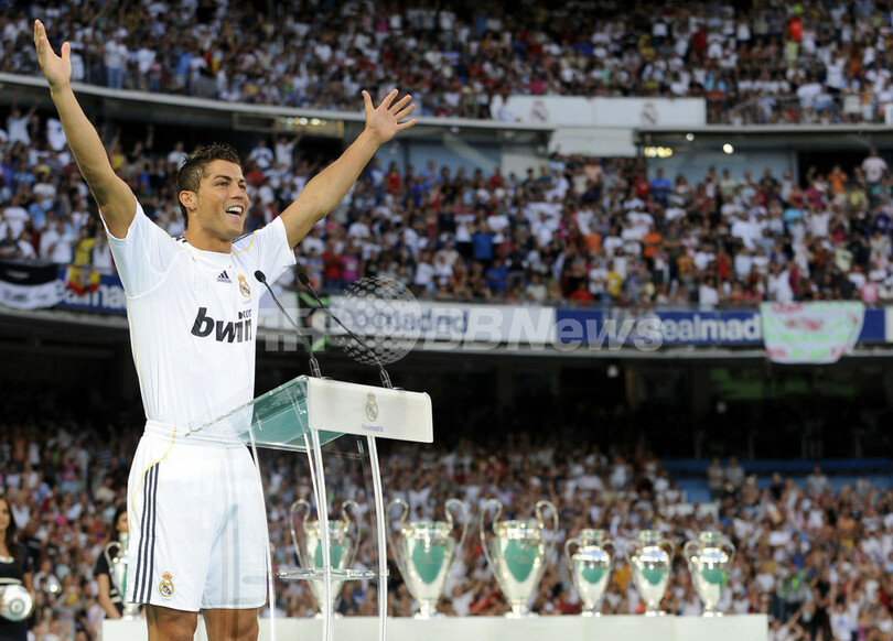 【7月7日 AFP】(写真追加)スペイン1部リーグのレアル・マドリード(Real Madrid)は6日、史上最高額の移籍金9400万ユーロ(約129億円)で移籍したクリスティアーノ・ロナウド(Cristiano Ronaldo)の入団発表をクラブの本拠地サンチャゴ・ベルナベウ(Santiago Bernabeu Stadium)で行った。同クラブによるとスタジアムには8万人近くが集まり、ロナウドを歓迎したという。