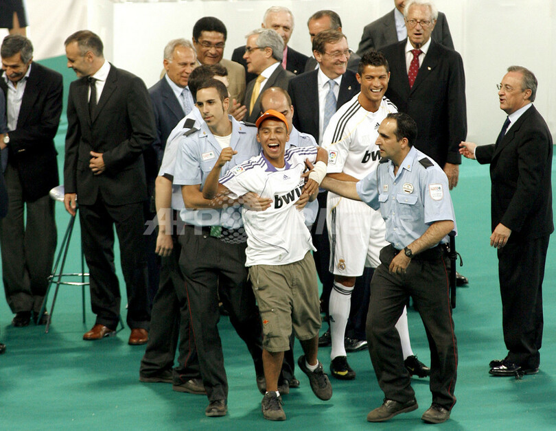 イングランド・プレミアリーグのマンチェスター・ユナイテッド(%%Manchester United%%)から念願の移籍がかなったクリスティアーノ・ロナウドは、ファンの前で「ここにいることに大きな幸せを感じている。レアル・マドリードでプレーするという小さい頃からの夢がかなった。ただ僕を見るためだけに、スタジアムが満員になるとは思ってもいなかった」と語った。写真はグランドに進入したファンを止める警備員。(2009年7月6日撮影)(c)AFP/SALVADOR RODRIGUEZ