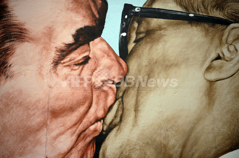 「兄弟のキス」は、イースト・サイド・ギャラリー(East Side Gallery)として知られる壁に旧ソ連のレオニード・ブレジネフ(Leonid Brezhnev)書記長と旧東ドイツの政治家エーリッヒ・ホーネッカー(Erich Honecker)議長の情熱的なキスシーンを描いたもので、作者のロシア人アーティスト、ドミトリー・ヴルーベリ(Dmitry Vrubel)さんが前月16日から描き直していた。(c)AFP