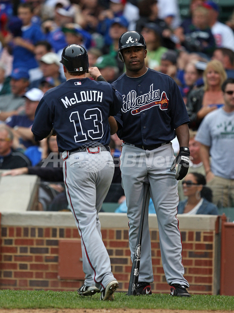 試合は4-1でブレーブスが勝利した。写真は9回、本塁を踏みギャレット・アンダーソン(%%Garret Anderson%%)から祝福されるブレーブスのネイト・マクラウス(%%Nate McLouth%%、左)。(2009年7月8日撮影)(c)AFP/Getty Images/Jonathan Daniel