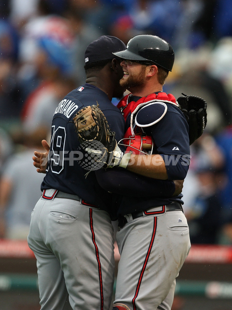試合は4-1でブレーブスが勝利した。写真は試合を終えて勝利の喜びを分かち合うブレーブスのブライアン・マッカン(%%Brian McCann%%、右)とラファエル・ソリアーノ(%%Rafael Soriano%%)。(2009年7月8日撮影)(c)AFP/Getty Images/Jonathan Daniel