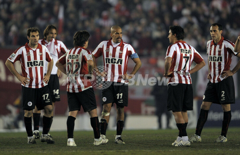 サッカーリベルタドーレス杯2009(%%Copa Libertadores de America 2009%%)決勝、エストゥディアンテス(%%Estudiantes%%、アルゼンチン)対クルゼイロEC(%%Cruzeiro EC%%、ブラジル)第1戦。試合は0-0の引き分けに終わった。写真はホームでの第1戦を引き分けで終え落胆するファン・セバスティアン・ベロン(%%Juan Sebastian Veron%%、中央)らエストゥディアンテスの選手たち。(2009年7月8日撮影)(c)AFP/JUAN MABROMATA