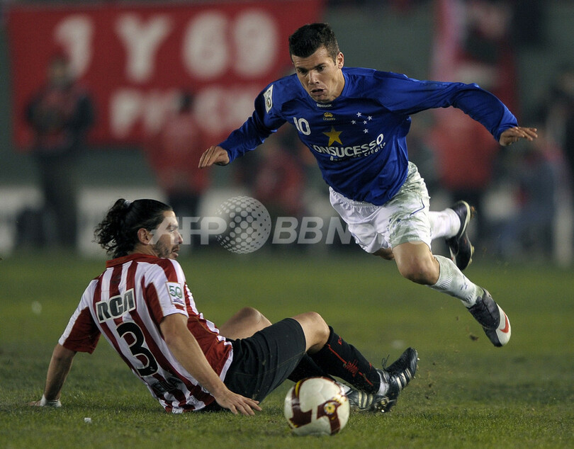 サッカーリベルタドーレス杯2009(%%Copa Libertadores de America 2009%%)決勝、エストゥディアンテス(%%Estudiantes%%、アルゼンチン)対クルゼイロEC(%%Cruzeiro EC%%、ブラジル)第1戦。試合は0-0の引き分けに終わった。写真はエストゥディアンテスのクリスティアン・セジャイ(%%Christian Cellay%%)からスライディングを受けるクルゼイロのバグネル(%%Wagner Ferreira dos Santos%%、右)。(2009年7月8日撮影)(c)AFP/ALEJANDRO PAGNI