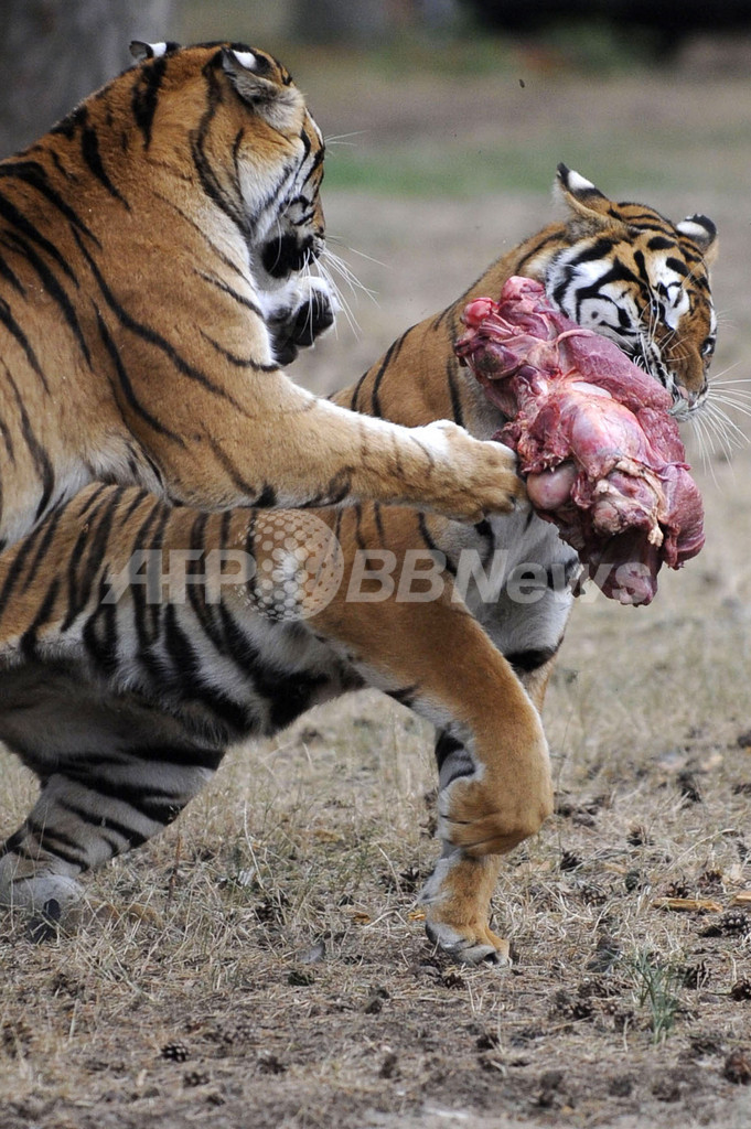 ニュース ライフ 食事中だ!肉をむさぼるドイツのトラ 2009年7月12日 14:07 発信地:ホーデンハーゲン/ドイツ [ ヨーロッパ ドイツ ] このニュースをシェア ‹ › ❮ 5/6 ❯ ドイツ北西部ホーデンハーゲン(Hodenhagen)のサファリパーク「Serengeti Park」で肉を奪い合う2頭のトラ。ここには経営破たんしたポルトガルの動物園から引き取られたオス1頭、メス7頭のトラがいる。平均的なトラの体重は250キロほどだが、2008年10月にここにやってきた時の体重は120-130キロしかなかった。その後回復し8日から一般公開されている(2009年7月8日撮影)。(c)AFP/DDP/NIGEL TREBLIN 画像作成中 ! 【7月12日 AFP】ドイツ北西部ホーデンハーゲン(Hodenhagen)のサファリパーク「Serengeti Park」で肉を食べるオスのトラ。このオスは、経営破たんしたポルトガルの動物園から、他の7頭のメスとともに2008年10月にここにやってきた。平均的なトラの体重は250キロほどだが当時の体重は120-130キロしかなかった。その後回復し8日から一般公開されている。(c)AFP ライフ 一覧へ> メディア・報道関係・法人の方向け 写真・動画 購入のお問合せ>