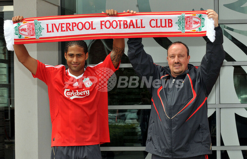 イングランド・プレミアリーグのリバプール(%%Liverpool FC%%)は9日、ポーツマス(%%Portsmouth FC%%)から獲得したイングランド代表のディフェンダー(DF)グレン・ジョンソン(%%Glen Johnson%%)の入団発表をクラブの練習場メルウッド・トレーニング・グラウンド(Melwood Training Ground)で行った。写真はチームマフラーを掲げるグレン・ジョンソン(左)とラファエル・ベニテス(%%Rafael Benitez%%)監督。(2009年7月9日撮影)(c)AFP/NEIL JONES