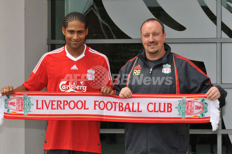 イングランド・プレミアリーグのリバプール(%%Liverpool FC%%)は9日、ポーツマス(%%Portsmouth FC%%)から獲得したイングランド代表のディフェンダー(DF)グレン・ジョンソン(%%Glen Johnson%%)の入団発表をクラブの練習場メルウッド・トレーニング・グラウンド(Melwood Training Ground)で行った。写真はチームマフラーを掲げるグレン・ジョンソン(左)とラファエル・ベニテス(%%Rafael Benitez%%)監督。(2009年7月9日撮影)(c)AFP/NEIL JONES