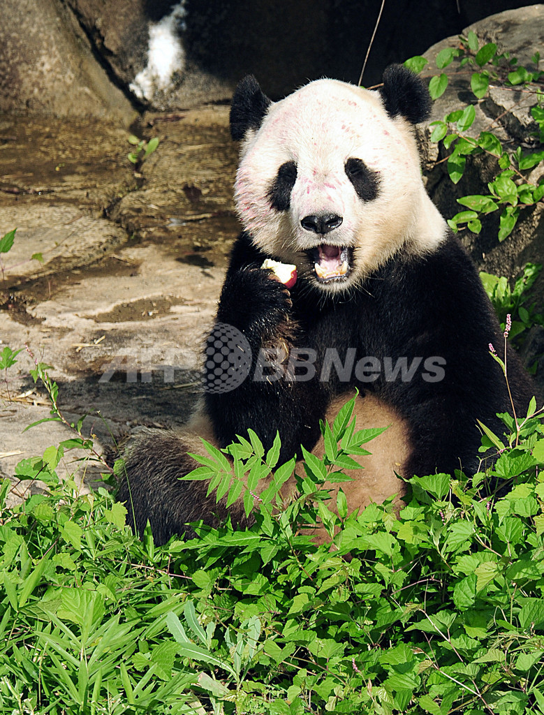 写真は、リンゴを食べるタイシャン(2009年7月9日撮影)。(c)AFP/Karen BLEIER