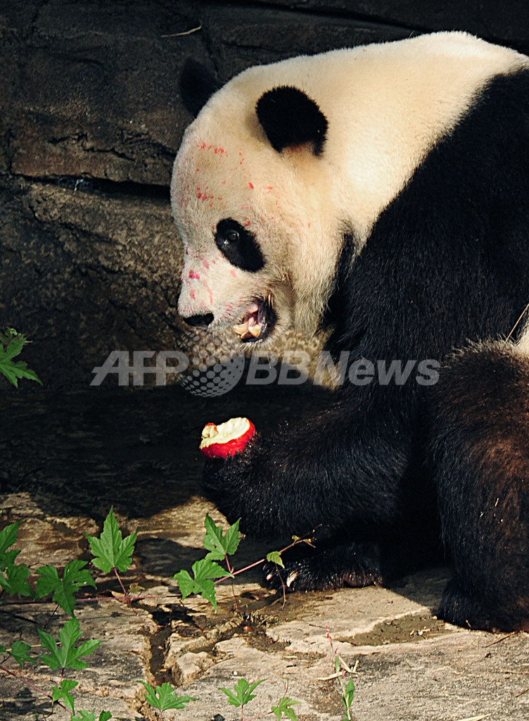 写真は、リンゴを食べるタイシャン(2009年7月9日撮影)。(c)AFP/Karen BLEIER