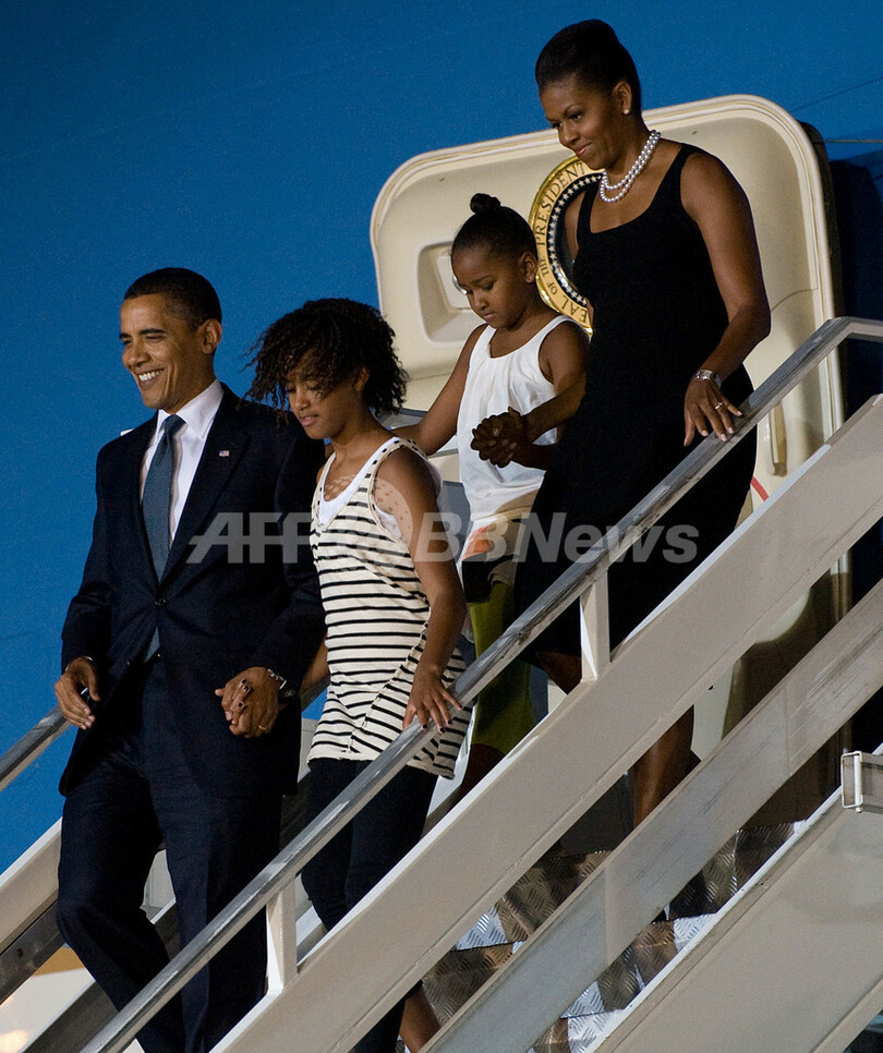 写真は、アクラ(Accra)に到着し大統領専用機エアフォースワン(Air Force One)から降りるオバマ米大統領一家(2009年7月10日撮影)。(c)AFP/Saul LOEB