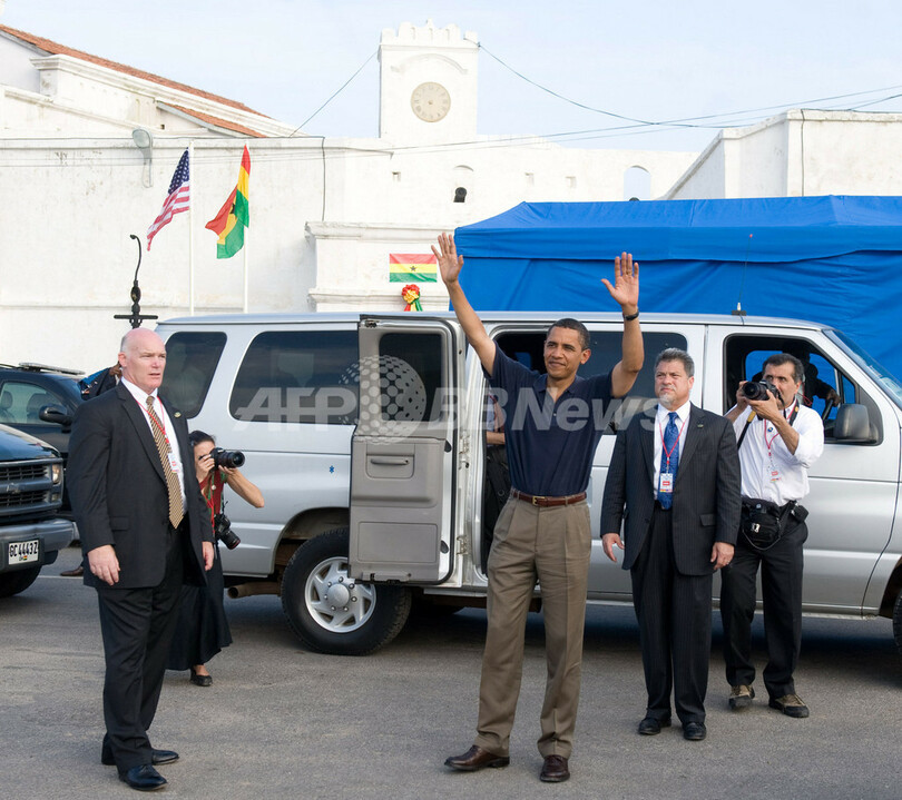 【7月12日 AFP】ガーナを訪問したバラク・オバマ(Barack Obama)米大統領は11日、ミシェル夫人(Michelle Obama)と2人の娘を伴って、かつて多数の奴隷が南北アメリカ大陸などに送り出されたケープ・コースト城(Cape Coast Castle)を訪問した。