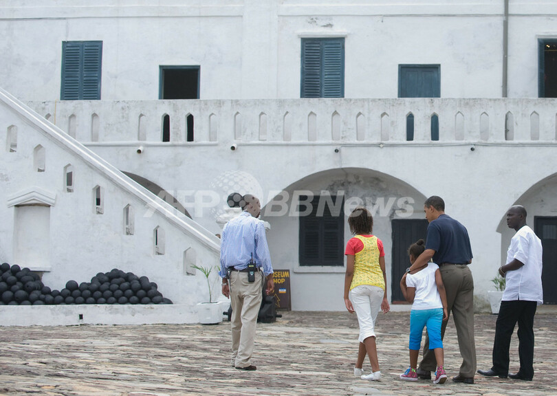 【7月12日 AFP】ガーナを訪問したバラク・オバマ(Barack Obama)米大統領は11日、ミシェル夫人(Michelle Obama)と2人の娘を伴って、かつて多数の奴隷が南北アメリカ大陸などに送り出されたケープ・コースト城(Cape Coast Castle)を訪問した。