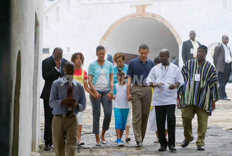 【7月12日 AFP】ガーナを訪問したバラク・オバマ(Barack Obama)米大統領は11日、ミシェル夫人(Michelle Obama)と2人の娘を伴って、かつて多数の奴隷が南北アメリカ大陸などに送り出されたケープ・コースト城(Cape Coast Castle)を訪問した。